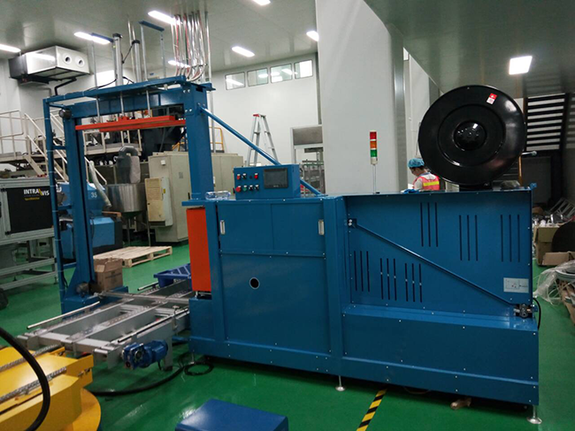 開放式弓架活動的穿帶能將棧板與捆包物牢固地捆包在一起便于移動及運輸,堆滿產品的棧板通過輸送滾筒線可實現無人化捆包生產線。