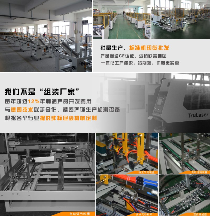 ·本自動(dòng)開箱機(jī)自動(dòng)開箱、自動(dòng)折合蓋、自動(dòng)封底,采用PLC+人機(jī)界面控制,操作簡單、維修方便,是自動(dòng)化規(guī)模生產(chǎn)必不可少的自動(dòng)開箱機(jī)設(shè)備